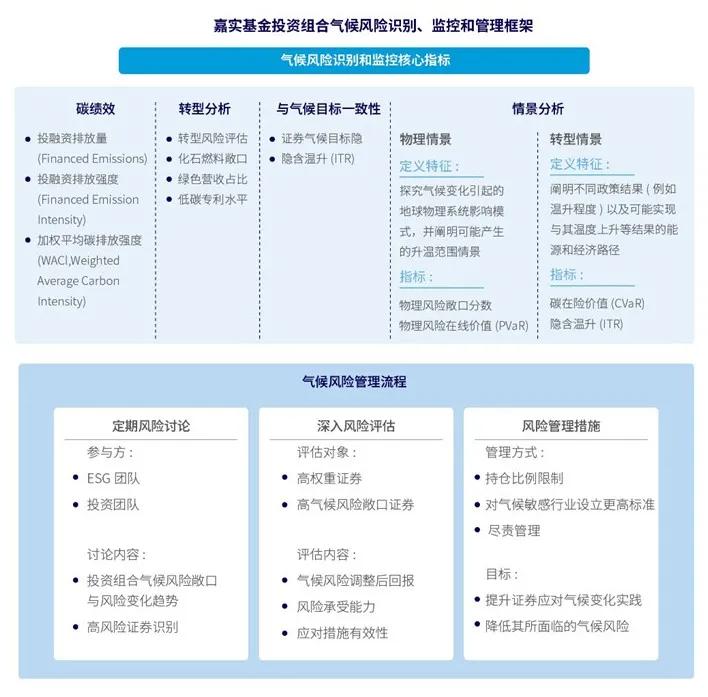 嘉实基金已构建起投资组合层面的气候风险识别、监控和管理体系,通过碳绩效、转型分析、与气候目标一致性等多维度识别和评估气候相关风险。