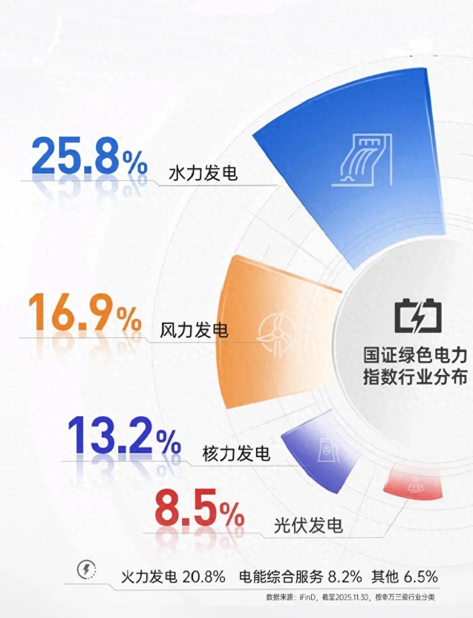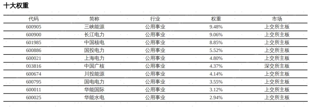 首先,指数“绿色电力”纯度高,权重股聚焦绿色电力龙头公司,“绿色”属性明显。根据iFinD,截至2025年12月17日,国证绿色电力指数行业分布聚焦清洁能源电力运营商,其中公用事业行业占比为93.58%,工业3.08%、信息技术1.21%、其他2.13%。指数前十大成分股合计占比55.83%,且多集中在风电、光伏、水电、核电等龙头企业。