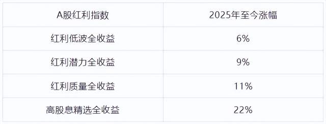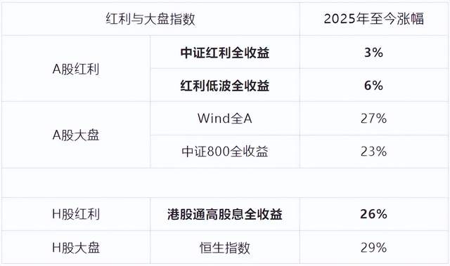 考虑到股息收益是红利资产的重要收益来源,我们以包含股息收益的红利全收益指数来计算收益率,今年以来,A股最有代表性的中证红利和红利低波全收益指数分别上涨3%和6%。港股最有代表性的中证港股通高股息全收益,2025年涨幅26%,略跑输恒生指数29%涨幅。港股红利资产由于股息率更高,受到险资青睐,取得了比A股红利资产更出色的表现。