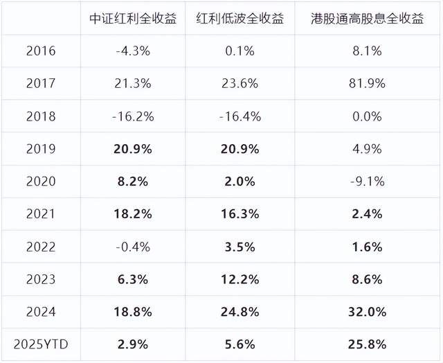 考虑股息收益在内,中证红利全收益指数自2019年以来的7年取得了6年正收益,2022年虽然是负收益但也只微跌0.4%。红利低波全收益自2019年以来连续7年都是正收益,而中证港股通高股息全收益自2021年以来连续5年正收益。