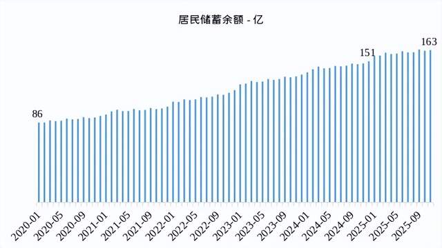 根据央行公布的数据,2024年底居民储蓄存款余额达到151万亿,而2025年11月进一步提升到163万亿。