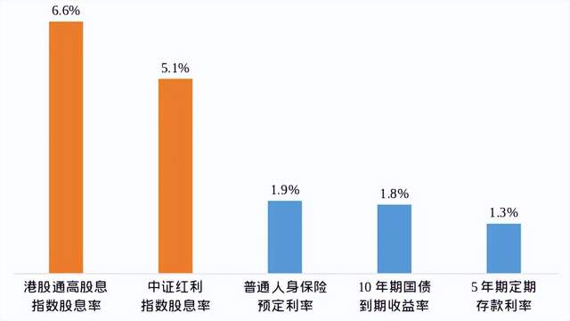 按照最新的数据,中证港股通高股息指数的股息率6.6%,中证红利指数股息率5.1%,相比于保险1.9%的预定利率,1.8%的10年国债收益率,和1.3%的5年期存款利率,依然有很大的回报率优势。